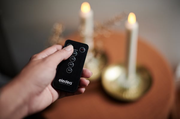 Mit der Fernbedienung können Sie alle unsere LED-Kerzen einzeln oder alle auf einmal aus einer Distanz von 4-5 m ein- und ausschalten und auf 2, 4, 6 oder 8 Stunden programmieren.
